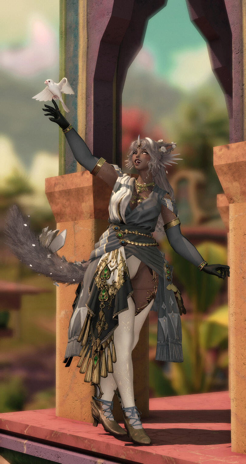 Advarithi Gharana [High Society – Thavnair] (Uncommon) — Those who find themselves in the heights of Radz-at-Han culture often hear of the illustrious Advarithi family, whether in context as a gharana of musicians or as patrons of other arts. But while an almost entirely hyur family, Vidhi herself has become a more common fixture under their auspices, her miqo'te appearance making her stand out all the more.