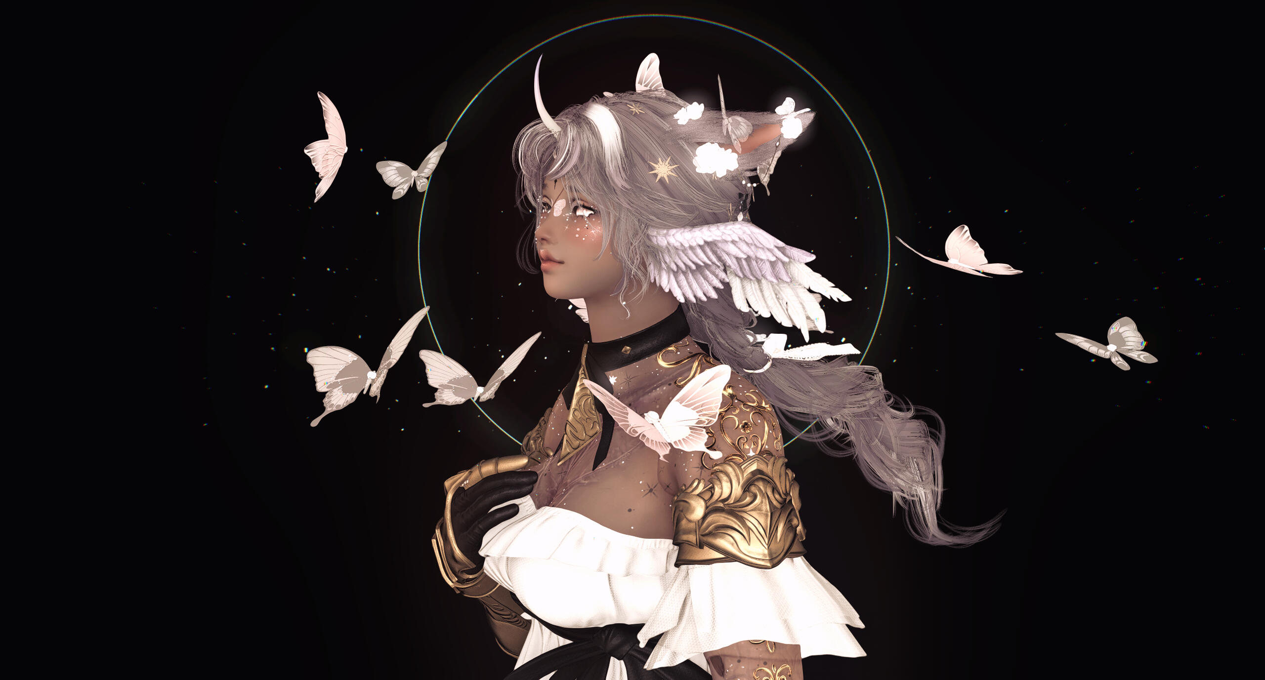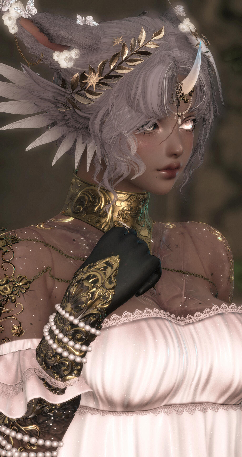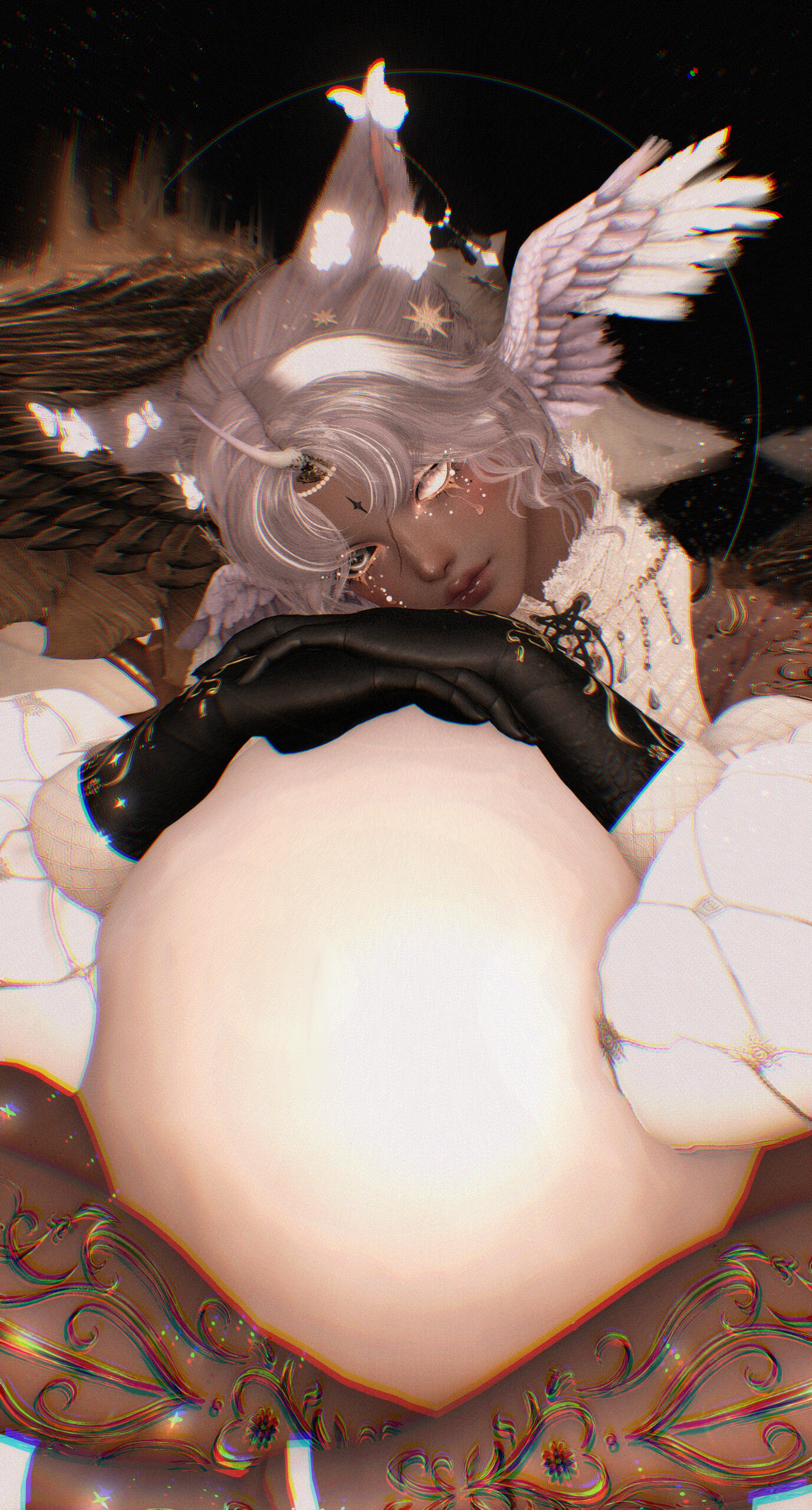notable features. Beauty Mark under pink eye, blackened hands from experimentation. Multiple surgical scars and burns adorn body. Heart shaped moles in various areas, with fawn and normal like star freckles, that shine when happiest or excited, wings were hyur ears usually sit, and strange markings adorn her body. Hair and tail blossom elpis flowers and attract butterflies near by.