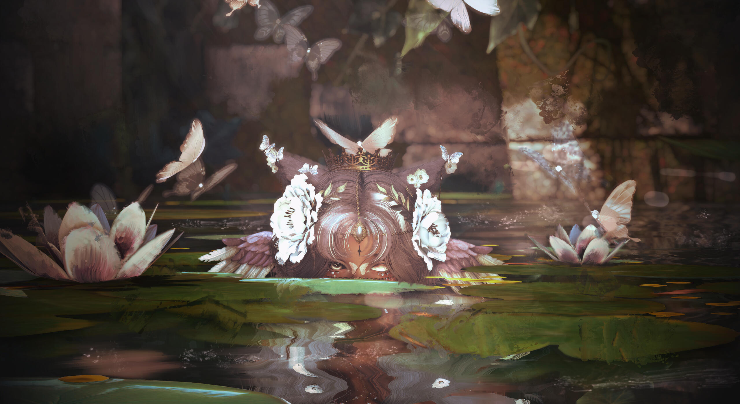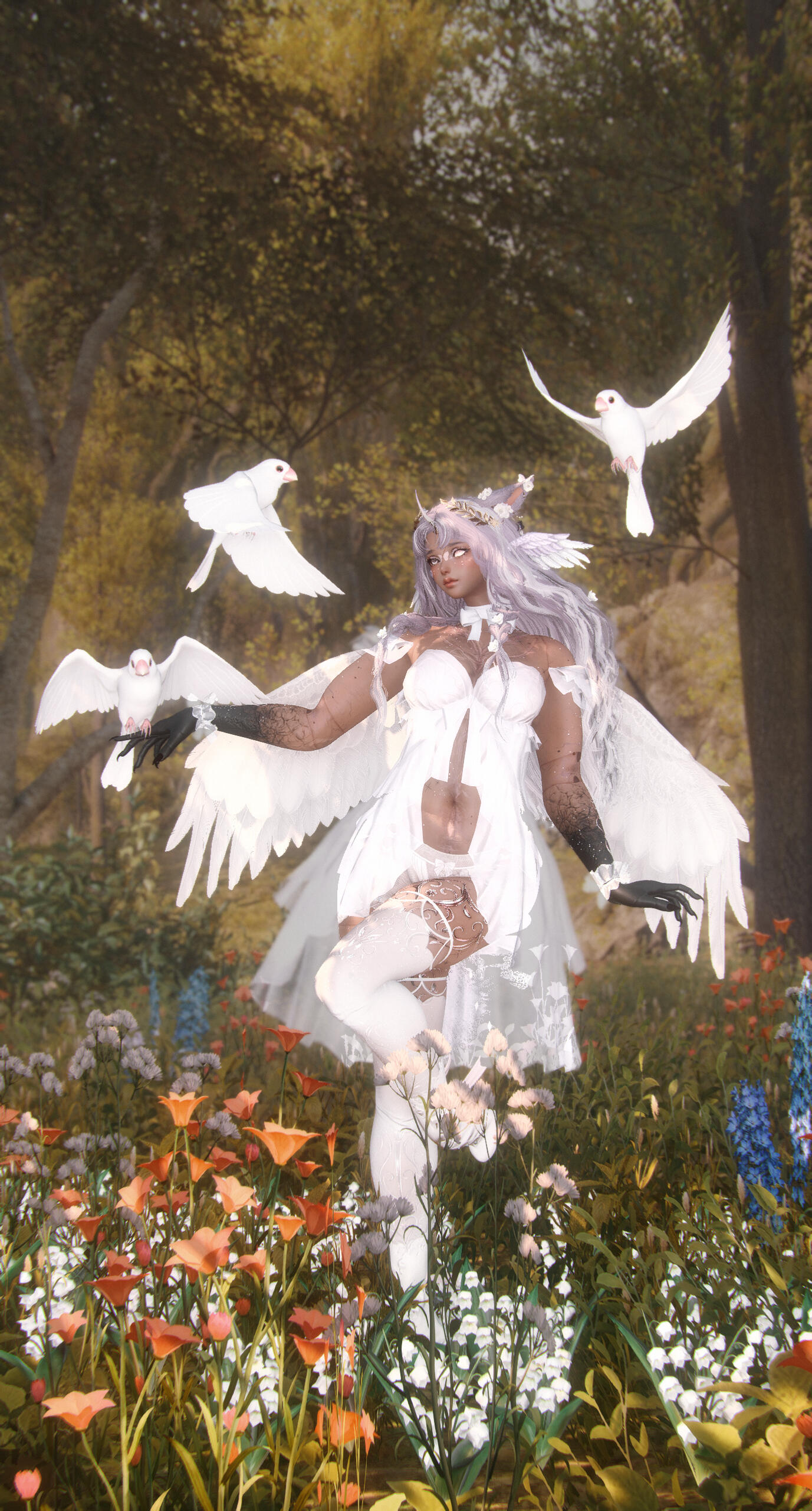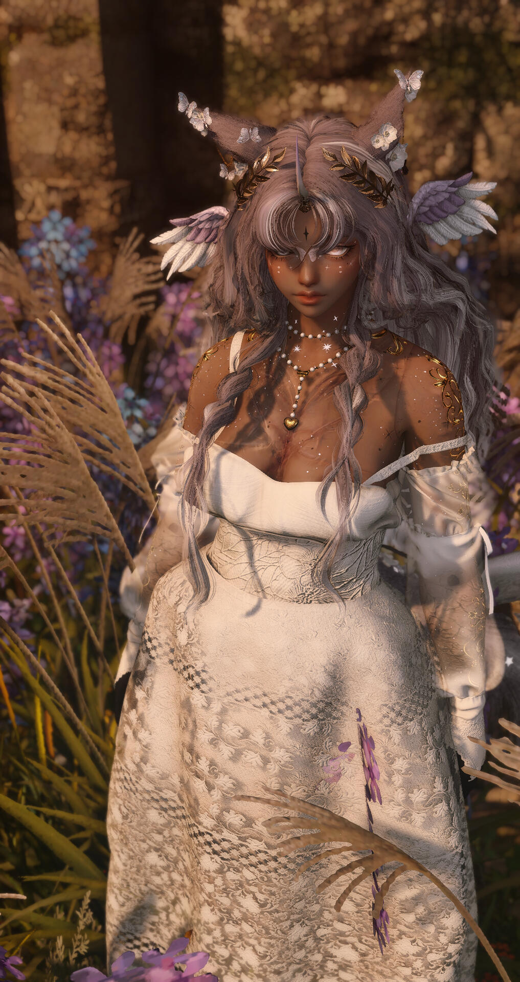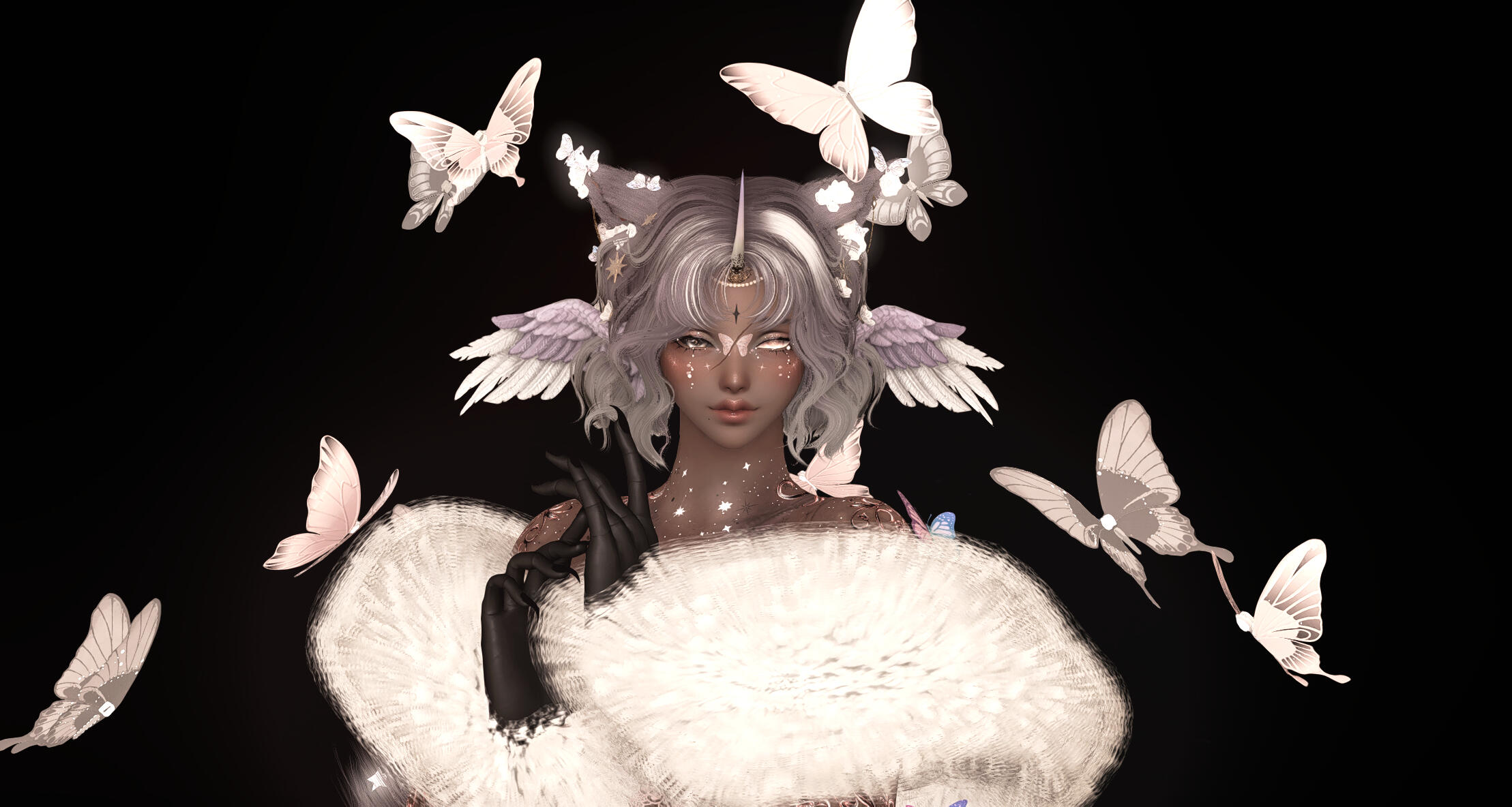 notable features. Beauty Mark under pink eye, blackened hands from experimentation. Multiple surgical scars and burns adorn body. Heart shaped moles in various areas, with fawn and normal like star freckles, that shine when happiest or excited, wings were hyur ears usually sit, and strange markings adorn her body. Hair and tail blossom elpis flowers and attract butterflies near by.